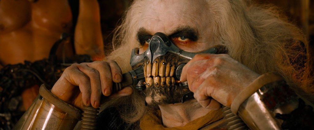 Hugh Keays-Byrne [18.5.47-2.12.2020] alias le terrible Immortan Joe dans Mad Max: Fury Road de George Miller, 36 ans après avoir joué l'affreux Toecutter dans Mad Max du même Miller © Warner Bros.