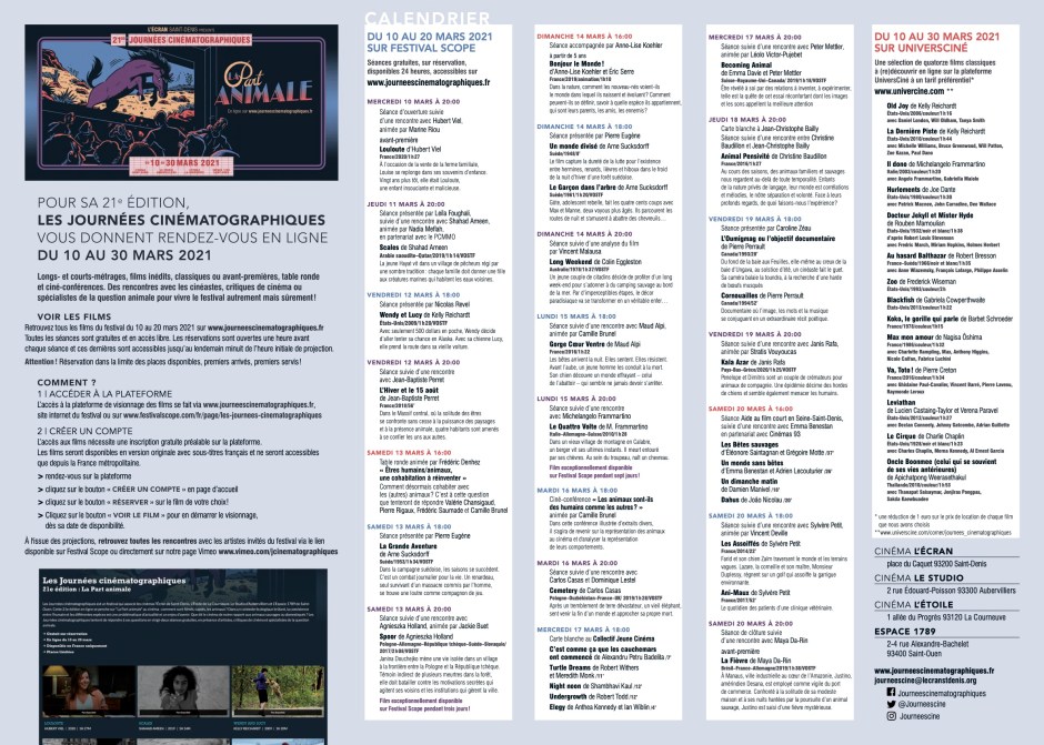 Les 21e Journées Cinématographiques interrogent chaque année les problématiques de la société contemporaine à travers l’histoire du cinéma. En nos temps de pandémie, de questionnements quotidiens et d’actualité écologique brulante, la thématique 2021 s’attechera à La Part animale, qui vit en, près et autour de nous. L’animal(ité) et les liens étroits, voire obscurs, que nous, humains, tissons avec lui(elle) se taillera donc la part du lion avec au programme près d’une trentaine de films courts et longs — classiques, avant-premières, raretés, inédits —, des rencontres avec les cinéastes à l’issue des séances, une ciné-conférence*, une table ronde** et 3 focus consacrés à Kelly Reichardt, Michelangelo Frammartino et Arne Sucksdorff.