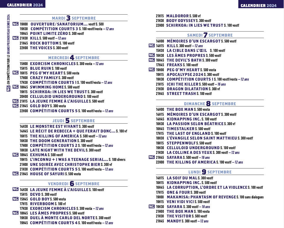 Au programme, vous retrouverez, comme chaque année, les compétitions* internationales de longs et courts métrages, des avant-premières, les thémas Mondovision, Nouveaux talents, & Découvertes Canal+** ainsi que des documentaires et des séances (très) spéciales. Sans oublier des cartes blanches offertes au musicien Flying Lotus, au compositeur James G. Thirlwell aka Foetus, à la réalisatrice Coralie Fargeat, à l’actrice-réalisatrice Noémie Merlant ainsi qu’aux réalisateurs Stéphan Castang et Alexis Langlois.