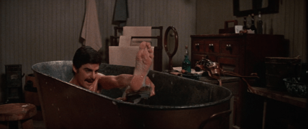 Tel est pris qui croyait prendre. Miller/Leonard Nimoy [26/03/31 — 27/02/15], chasseur de primes ténébreux et fort velu, parti à la poursuite de Catlow, un hors-la-loi* d’une indécente jovialité et d’un toupet confondant, se voit fort dépourvu quand, au milieu de ses ablutions, surgit, armé d’une jarre, l’objet de sa poursuite.